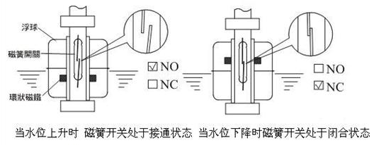 螺紋連接 產(chǎn)品規(guī)格︰ PP,PVDF材質(zhì)可適用于強酸鹼場所;SUS304/316金屬材質(zhì)適用于高溫高壓桶槽 接線盒規(guī)格*齊全,有塑膠、鋁合金、不銹鋼防爆型,防護等級IP-65以上 接點容量50W/250VAC SPST或40W/250VAC SPDT 接續(xù)法蘭有JIS,DIN,ANSI規(guī)格;牙口有NPT,PF,BSP等規(guī)格 可做多點控制、安裝容易、節(jié)省成本 特殊規(guī)格亦可配合客戶需求訂 。下圖為常閉(NC)及常開(NO)時浮球開關(guān)的相關(guān)位置。不銹鋼浮球液位開關(guān)工作原理圖